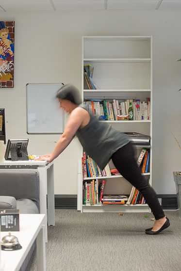 As you would with a normal push up, keep your back and your bottom flat and slowly bend your arms lowering yourself towards your desk. As your chin comes level with your elbows, push back up to your starting position – repeat 20 times.